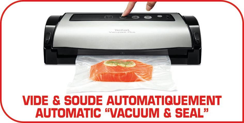 Grâce à la machine de mise sous vide Vacupack Plus, dites stop au gaspillage alimentaire. Faites des économies d’argent en conservant vos aliments plus longtemps. Le système d’emballage sous vide évacue l’air et renferme les bienfaits nutritionnels et les saveurs de vos aliments pour une meilleure conservation. Plusieurs fonctions sont disponibles pour s’adapter à vos aliments, une fonction automatique pour un vide et un scellage rapide, possibilité de faire du scellage uniquement. Une fonction "humide ou sec" qui adapte automatiquement la vitesse d'aspiration au type d'aliment choisi. Une fonction "Soudure" et "Pulse" offrent un contrôle total afin de personnaliser manuellement l'extraction de l'air et la soudure idéale pour vos aliments les plus fragiles tel que vos biscuits ou vos pâtisseries. Une fonction "Stop" pour arrêter votre extraction d’air à tout moment et préserver l’intégrités de vos aliments. Vacupack Plus au design moderne noir et inox s'intègrera facilement dans votre cuisine. Pratique son range cordon intégré vous permet un rangement facile. Livré avec 2 rouleaux de film plastique de taille différentes (22 cm x 3 cm et 28 cm x 3 m) ainsi que 2 boîtes repas sous vide (600 ml et 800ml) et d'un tuyau d'aspiration.Ces accessoires sont idéaux pour conserver sous vide votre repas, viandes, poissons, légumes ou encore des liquides ou des aliments fragiles. Convient à la conservation au réfrigérateur. Les boîtes et leur convercle passent au lave-vaisselle.