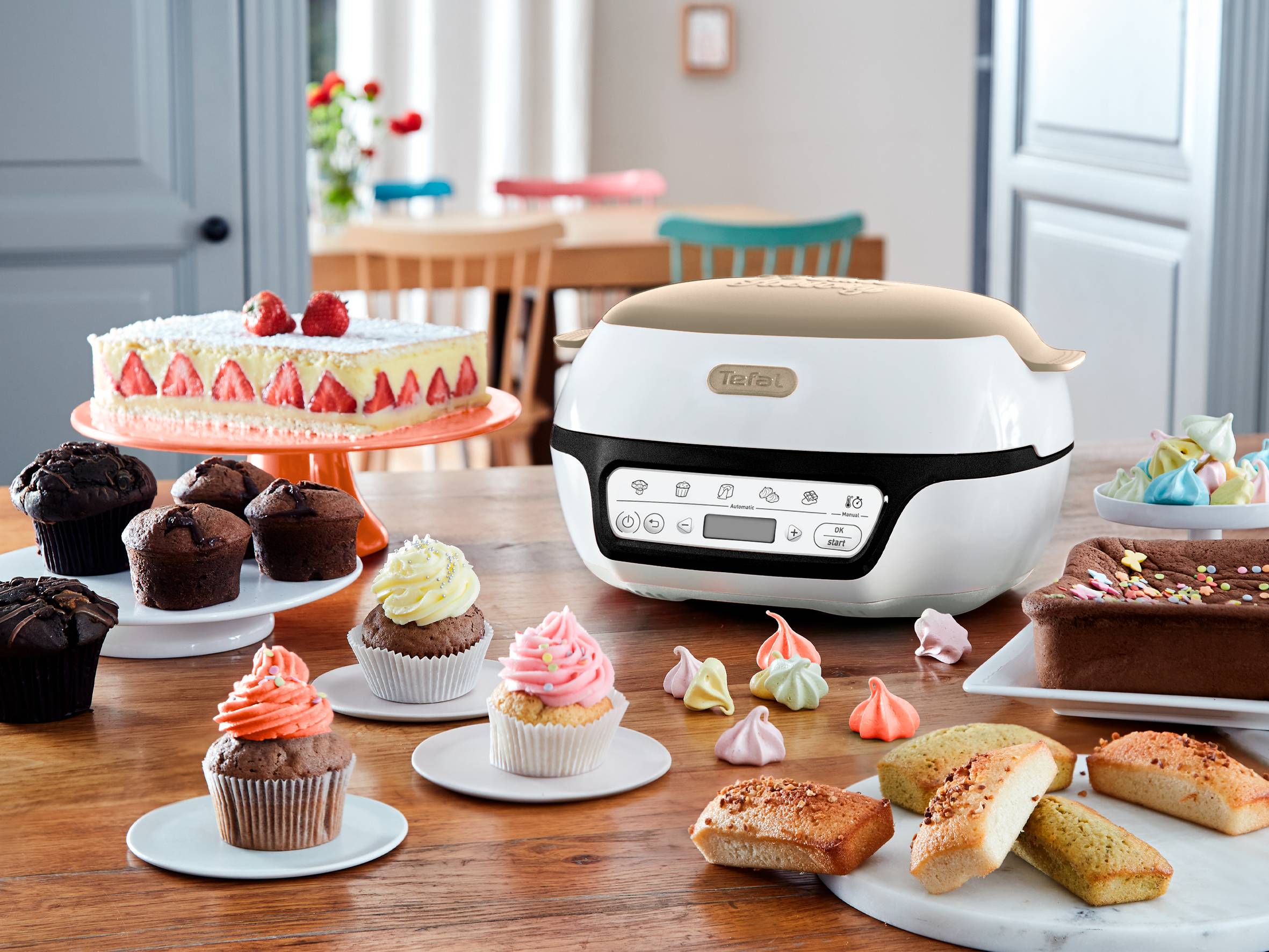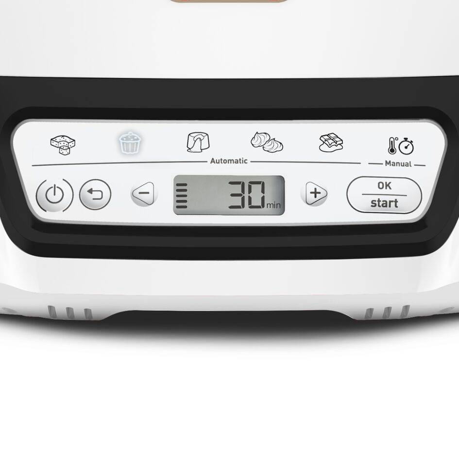 FOUR A GATEAUX INTELLIGENT : pour réussir tous vos gâteaux et pâtisseries et même vos crèmes dessert en toute simplicité et à tous les coups. RÉSULTATS PARFAITS : 5 programmes automatiques (Gâteau à partager, gâteaux individuels, cœurs coulants, meringues, fondant chocolat) + 1 mode manuel. PAS DE PRECHAUFFAGE NECESSAIRE : Pas de préchauffage et jusqu'à 50 % d'économie d'énergie par rapport aux fours traditionnels Classe énergétique A (tests effectués en 2024 sur des fondants au chocolat, des muffins, des yaourts et des gâteaux au citron). UN REGLAGE MANUEL: pour un contrôle et une liberté ultimes lors de la cuisson COMPACT : pour un rangement facile. Engagement de réparabilité 15 ans au juste prix grâce à notre réseau de 6 200 réparateurs dans le monde ACCESSOIRES INCLUS : Un grand moule en aluminium antiadhésif, 6 moules à muffins Creabake et une grille de support pour les moules FACILE À UTILISER : interface intuitive. COMPATIBLE : avec tous les moules Téfal CreaBake (muffins, cannelés, madeleines, mini-cakes...). RESTEZ INSPIRE : application mobile gratuite dédiée. Engagement de réparabilité 15 ans au juste prix grâce à notre réseau de 6200 réparateurs dans le monde.