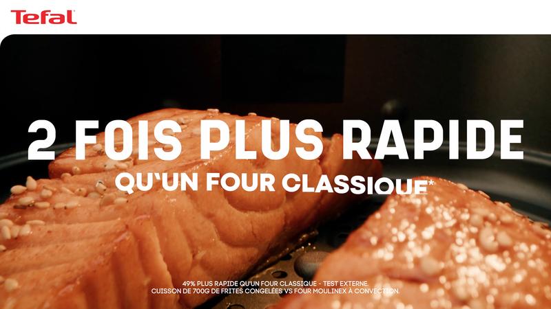 *2 fois plus rapide qu'un four / 49% plus rapide qu'un four. Test réalisé sur 600 ml de frites surgelées, comparé à un four à convection Tefal / Moulinex. **49% plus faible qu'un four à convection. Test réalisé sur 600 g de frites surgelées, par rapport à un four à convection Tefal/Moulinex.