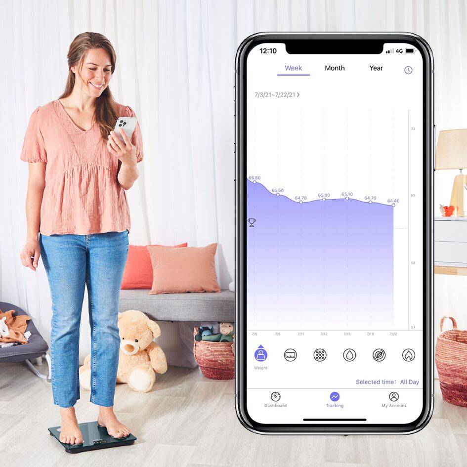 Application dédiée ultra-intuitive pour vous aider à mieux connaître votre corps et à gérer vos objectifs corporels 10 indicateurs avec le poids, l'IMC, la graisse corporelle, la masse musculaire, la masse osseuse, l’eau corporelle, la graisse sous cutanée, la graisse viscérale, le taux métabolique de base et l'âge métabolique Visualisez facilement votre progression grâce à une application connectée gratuite et facile à utiliser, incluant des tableaux de bord et des graphiques fonctionnels Option permettant de définir vos objectifs en termes de poids et de masse grasse, pour vous aider à obtenir des résultats positifs Nombre illimité d'utilisateurs, idéal pour entretenir votre forme physique avec votre famille et vos amis ; la seule limite est la mémoire de votre téléphone Synchronisez votre application avec Google Fit, Apple Health et Fitbit pour plus de praticité Grand écran rétroéclairé et des chiffres de 19 mm de hauteur pour une lecture facilitée Plateau en verre 30 x 30 cm, capacité de 180 kg, graduation 100g près garantissant une utilisation par tous Livré avec 3 piles pour vous permettre d'utiliser la balance immédiatement