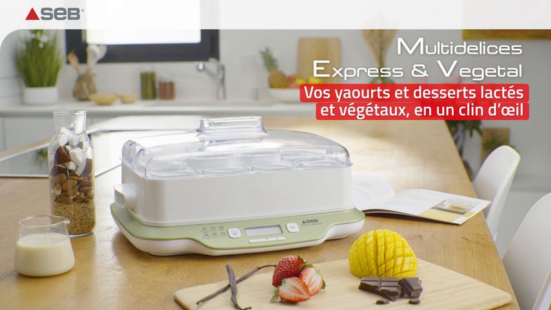 Multi Delices Express & Vegetal est la yaourtière qui saura satisfaire les goûts de chacun ! Obtenez des résultats rapides et faciles et réalisez un large éventail de délicieuses recettes : yaourts, fromages blancs, desserts avec ou sans produits laitiers, ou encore des recettes végétaliennes. Préparez des yaourts maison naturels en deux fois moins de temps*, ainsi que de succulentes recettes végétales en utilisant des boissons à base d'amande, de soja ou d'avoine. Le tout, avec une grande capacité idéale pour régaler toute la famille !