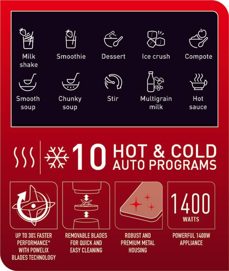 Un blender polyvalent, adapté à une grande variété de recettes chaudes, froides, solides et liquides. 10 programmes automatiques : 4 programmes froids (smoothie, milkshake, dessert, glace pilée) et 6 programmes chauds (compote, soupe veloutée, soupe avec morceaux, mélange, lait multigrain, sauce) à portée de main. Assure un mixage à grande vitesse grâce à un moteur de 1 400 W et des lames Powelix exclusives qui sont jusqu'à 30 % plus rapides*. Les lames amovibles facilitent le nettoyage, tout comme la fonction de nettoyage en profondeur qui élimine 99,99 % des bactéries** sans avoir besoin de liquide vaisselle. Conçu pour être facile à réparer, avec des pièces de rechange peu coûteuses et livrées rapidement pendant 15 ans et plus, grâce à plus de 6 200 centres de réparation dans le monde entier. L'accessoire panier vapeur inclus transforme le bol en un cuiseur vapeur de grande capacité (+/- 500 g), idéal pour préparer des repas sains Fabriqué à partir de matériaux haut de gamme, notamment un bol en verre de haute qualité, des finitions en métal et un écran tactile élégant pour une utilisation intuitive. Le système de refroidissement à air intégré garantit une durabilité optimale du moteur au fil du temps.