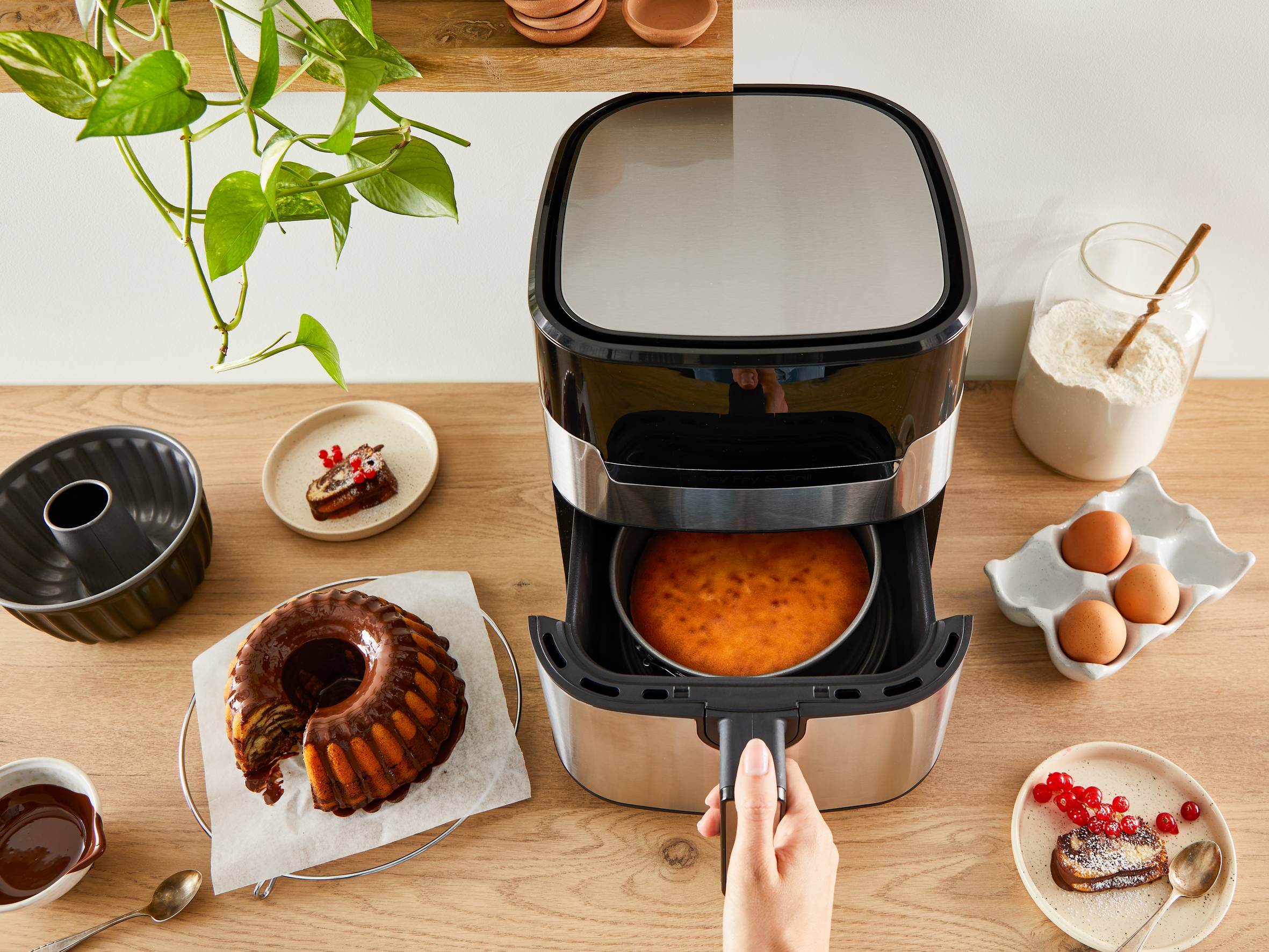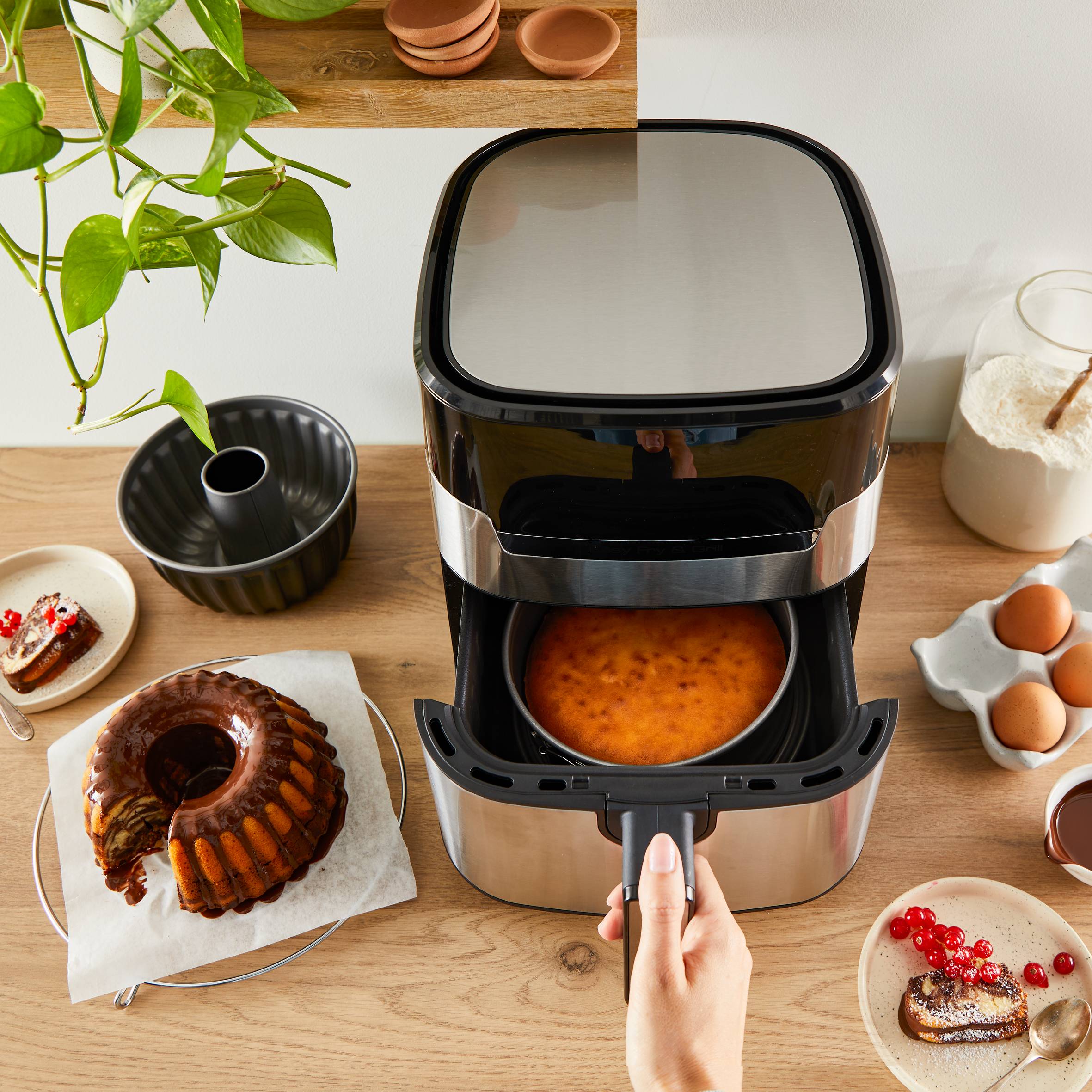 Un lot pour pâtisser avec votre friteuse à air, qui inclut deux moules compatibles avec toutes les friteuses à air Démoulage parfait et facile grâce à un revêtement renforcé en céramique, idéal pour une utilisation quotidienne Diffusion optimale de la chaleur pour une cuisson bien dorée de vos préparations sucrées et salées Acier carbone thermo-conducteur de haute qualité pour une distribution uniforme de la chaleur et des résultats parfaits Le revêtement antiadhésif renforcé en céramique permet une cuisson et un nettoyage sans effort au quotidien Fabrication en Allemagne selon des critères de qualité et de savoir-faire stricts