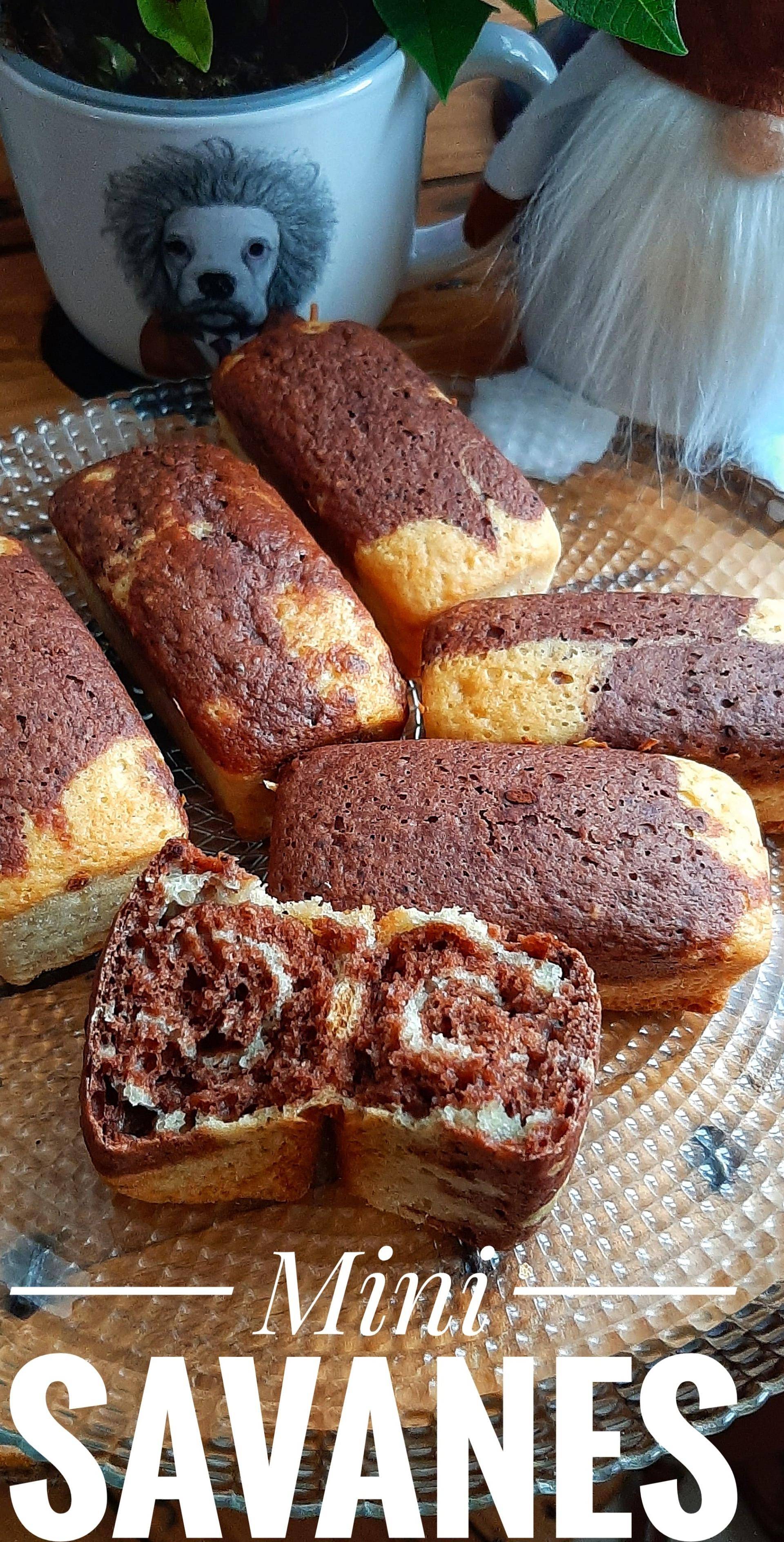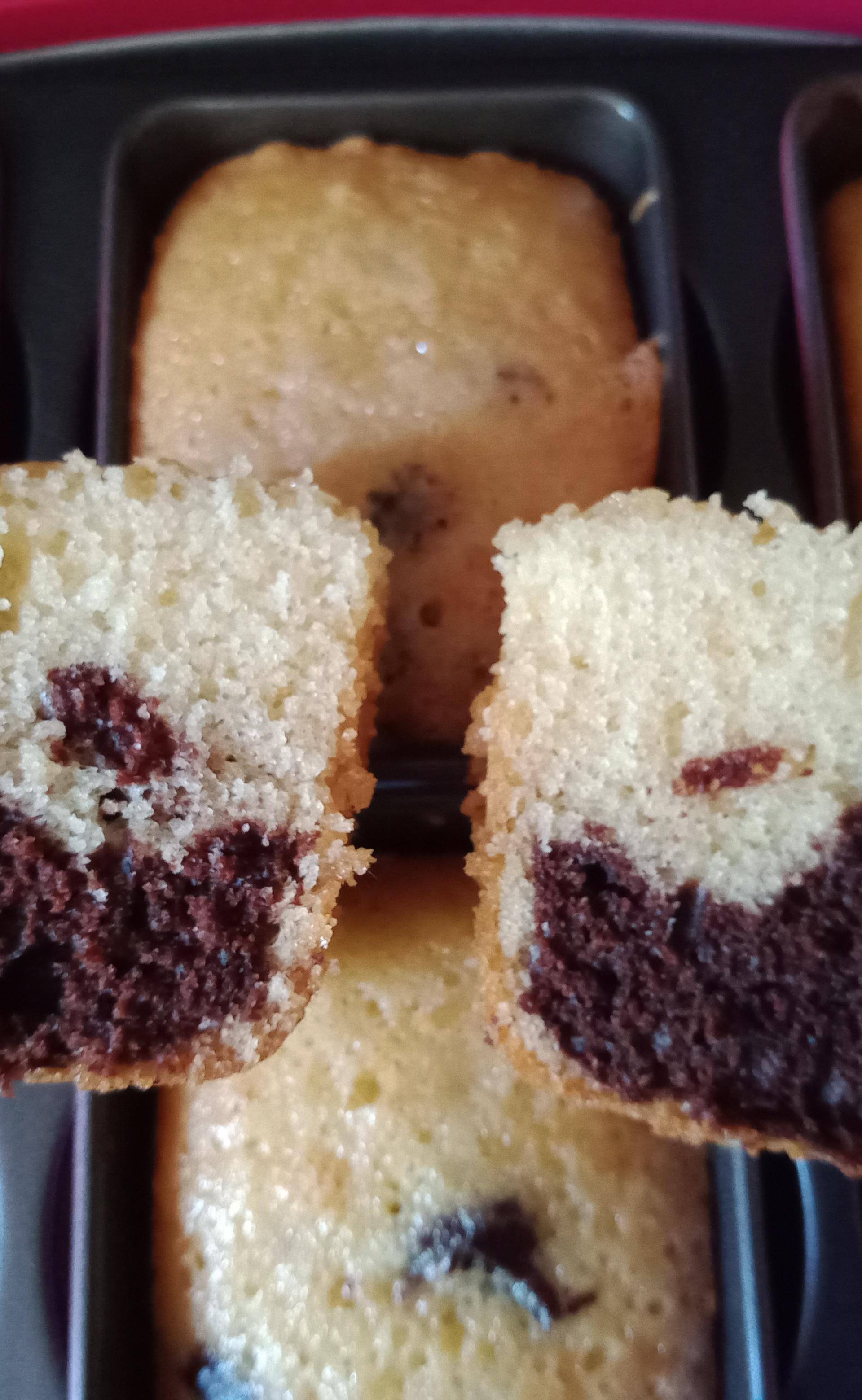 Ensuite verser dans les moules à mini cake en alternant la pâte vanille et la pâte chocolatée, une fois fait placé la pointe d'un couteau (en faisant attention aux moules bien sûr) au centre du moule pour tracer un trait imaginaire pour avoir une belle marbrure cette étape est optionnelle bien sûr