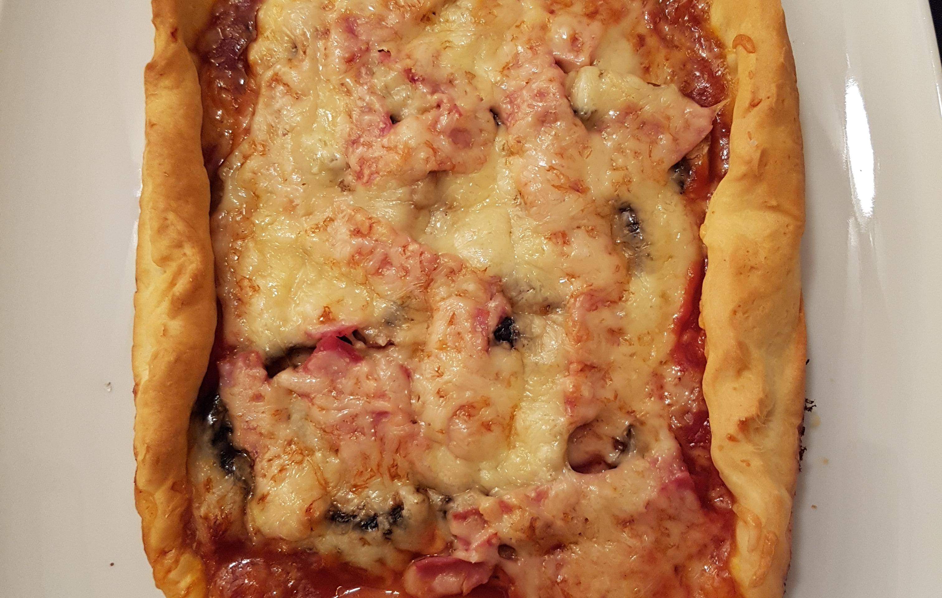 Étalez le coulis de tomate sur la pâte Mettre 1 tranche de jambon entière, les champignons émincés Mettre l'autre tranche de jambon coupée en lamelles et parsemez de gruyère râpé