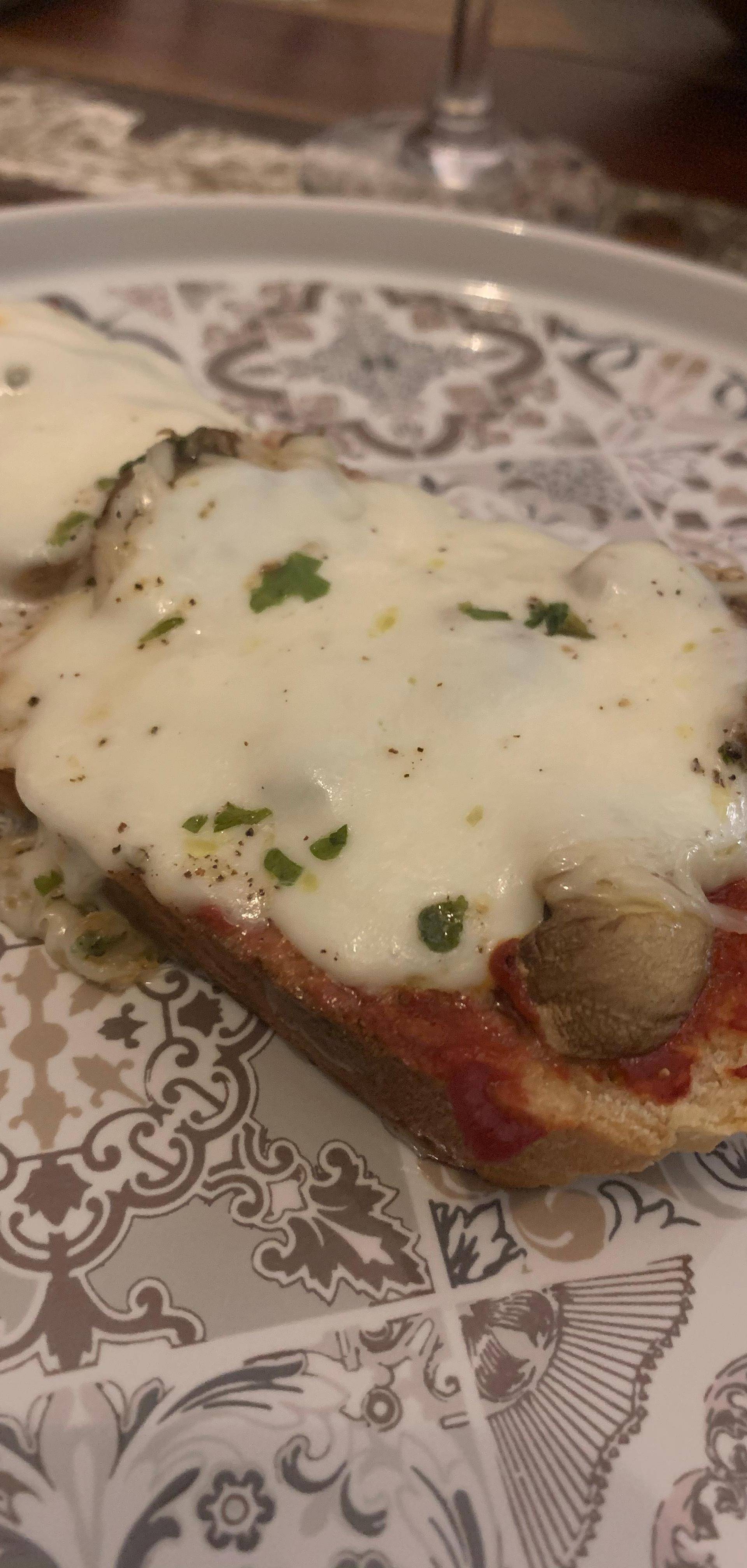 Frotter les tartines avec de l’ail et ajouter un filet d’huile d’olive. Garnissez les tartines avec, une cuillère a soupe de sauce tomate, une tranche de jambon, des tranches de champignons, du gruyère et pour finir la mozzarella. Assaisonner de persil. Sel. Poivre.