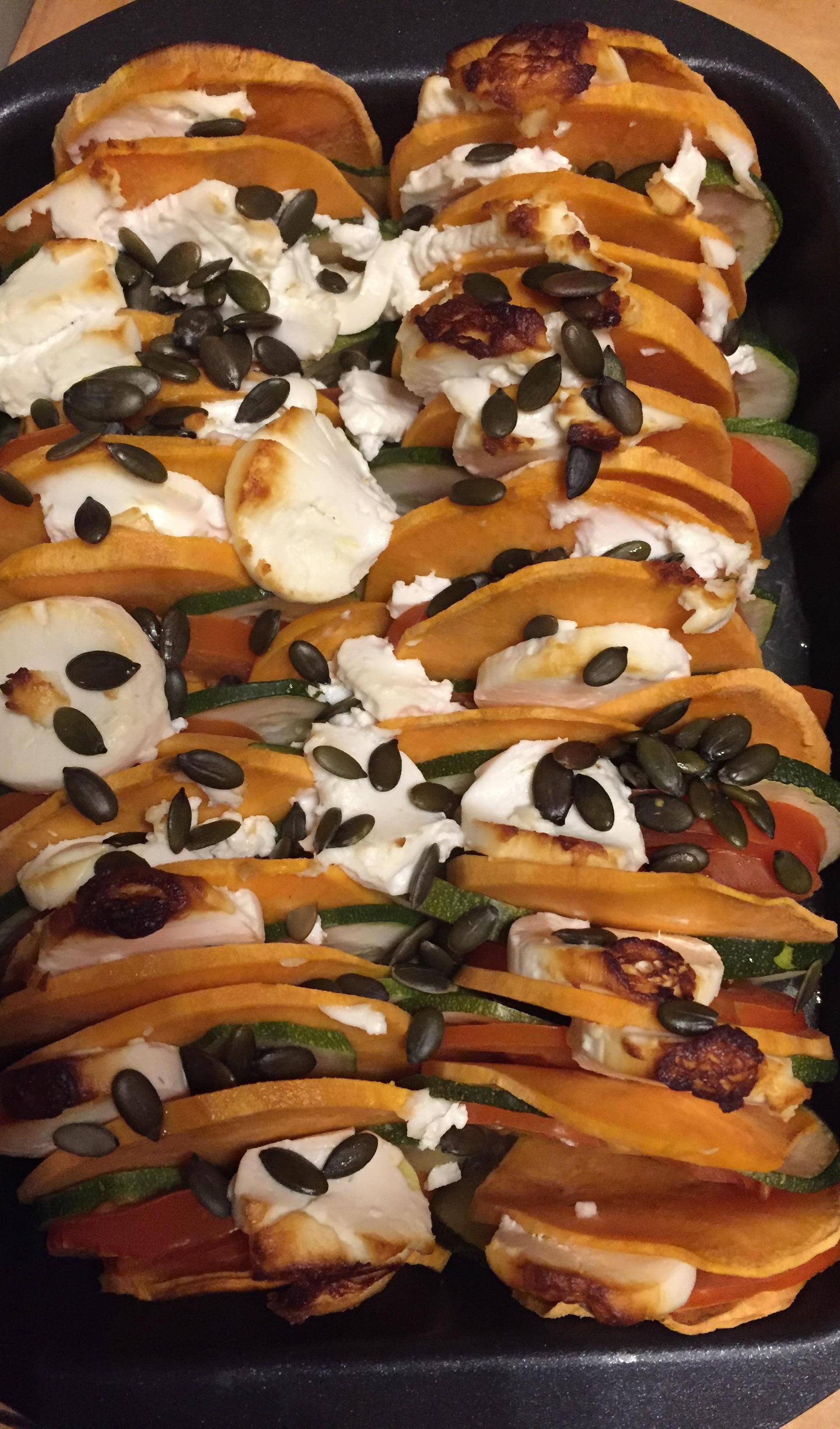 Rangez les légumes dans le moule anti-adhésif en les intercalant et en les serrant bien. Salez, répartissez le chèvre et parsemez les graines de courge et le thym, arrosez d’huile d’olive, enfourner 45 minutes